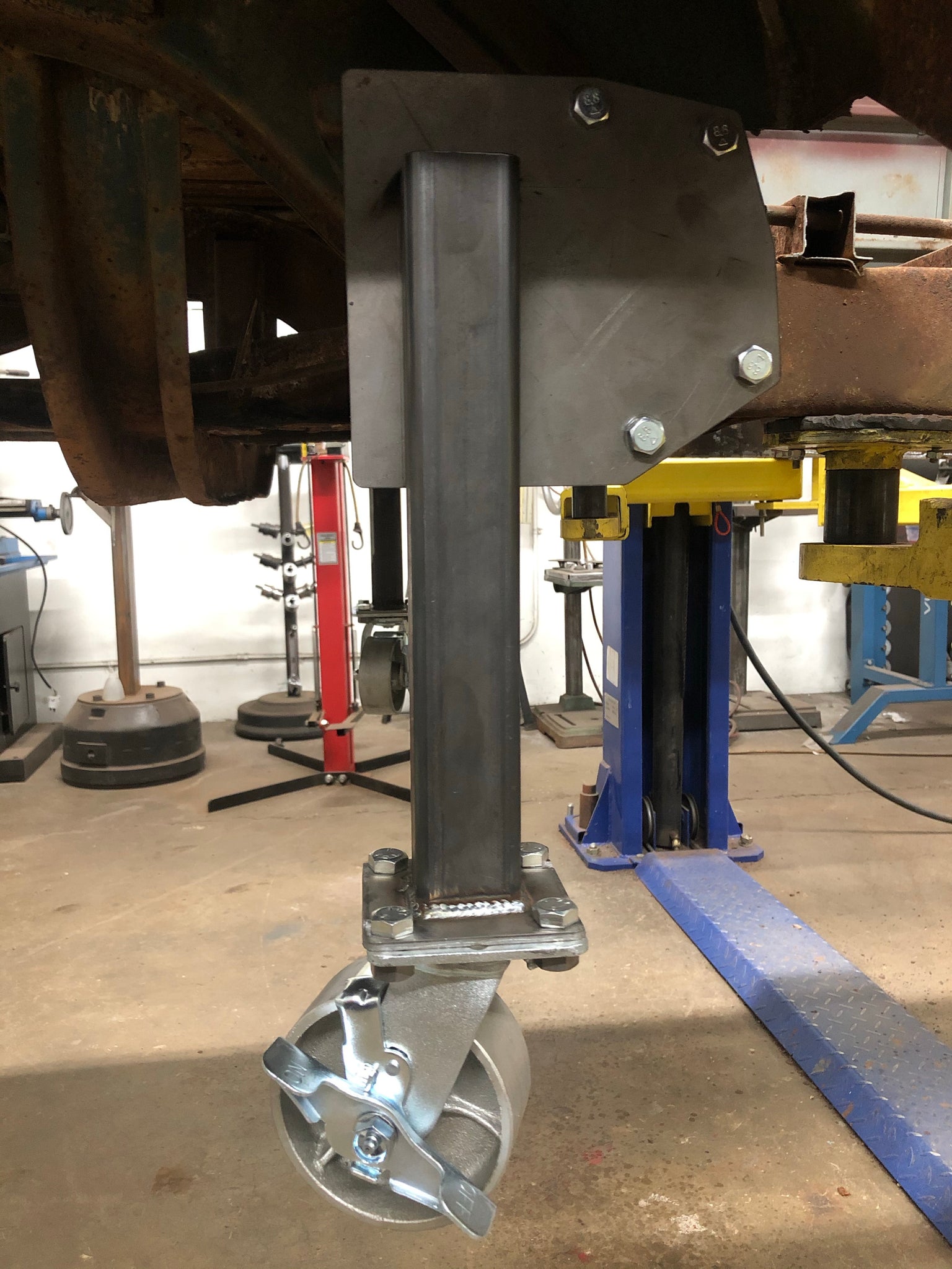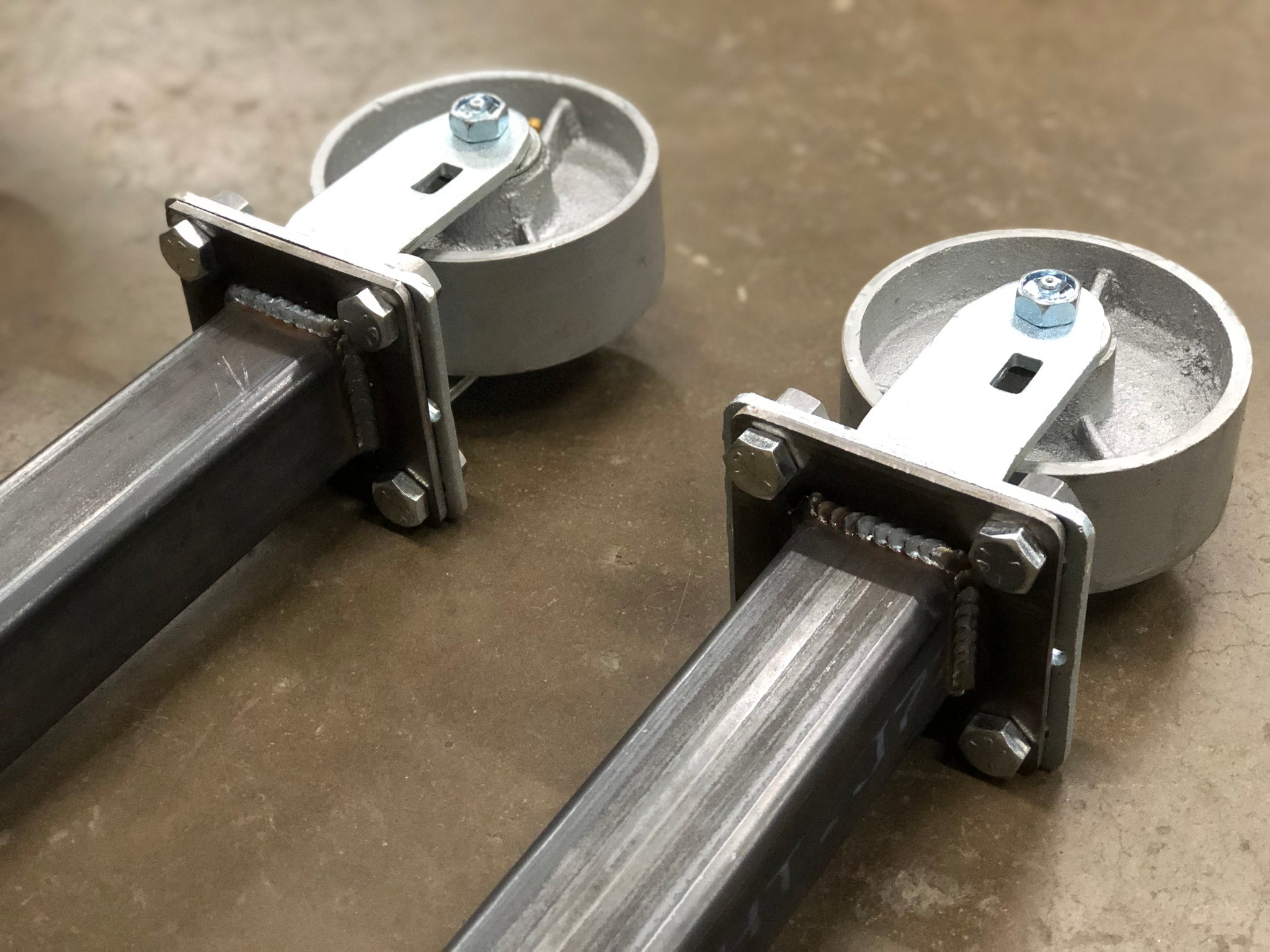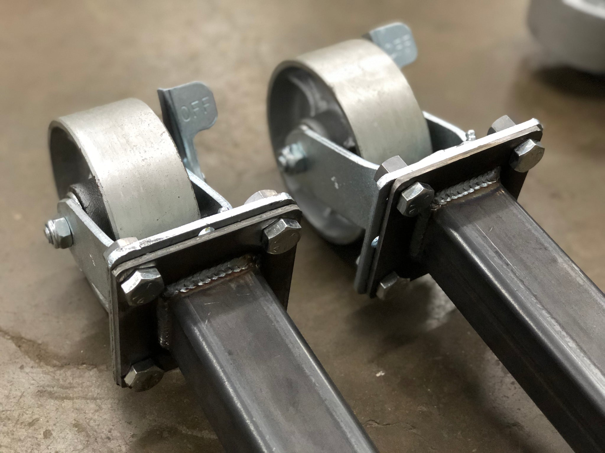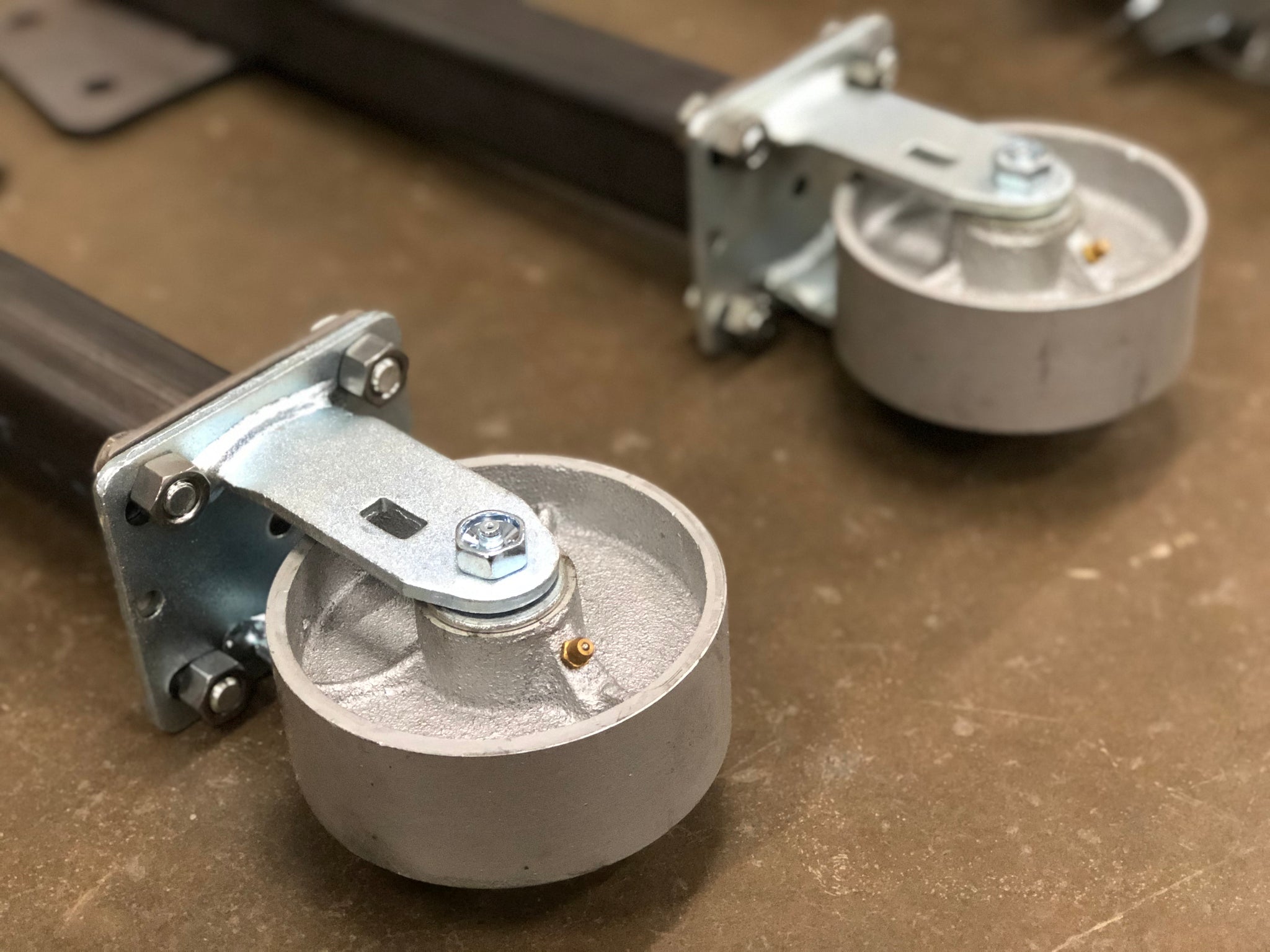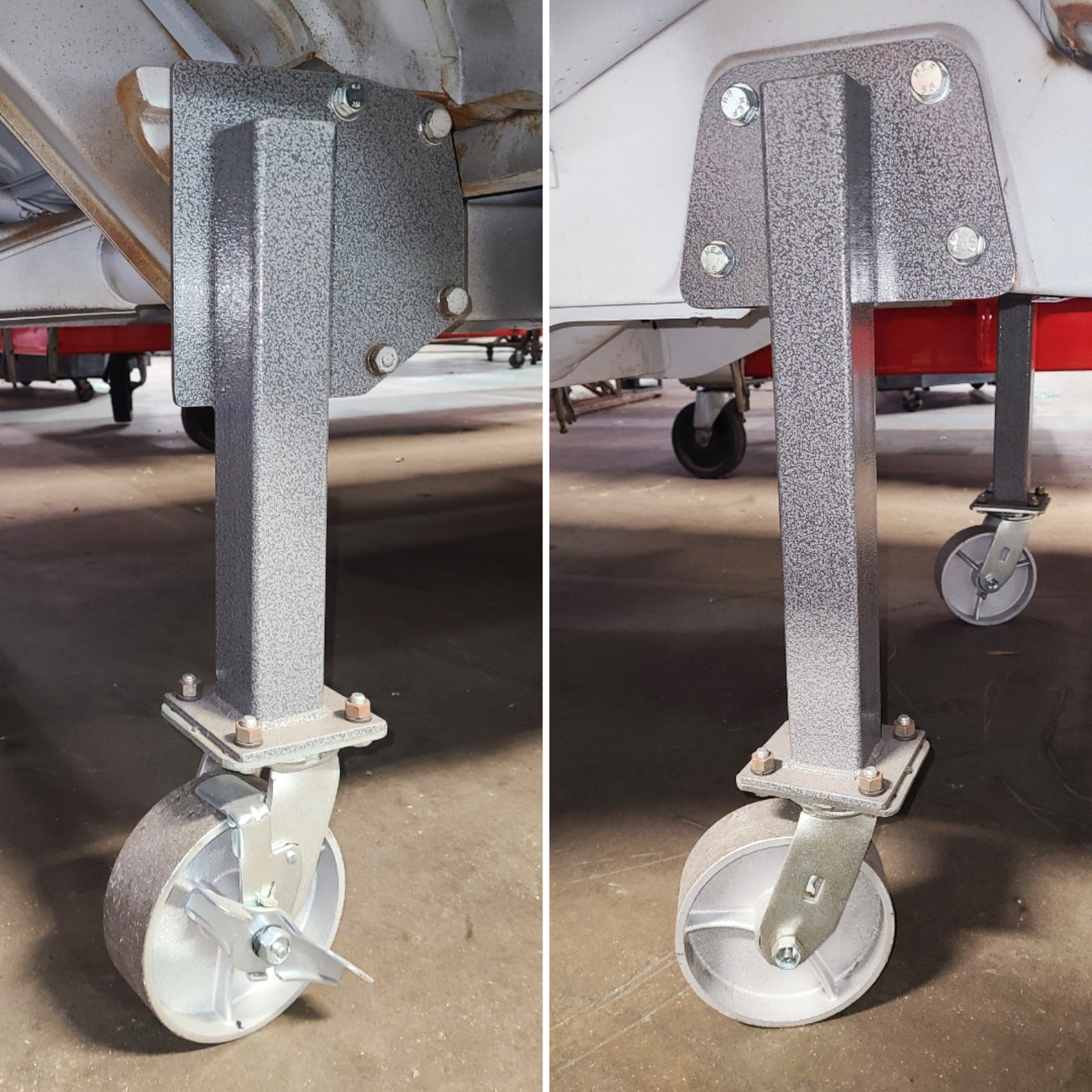 Each Kit is coated in a heavy-duty, powder coated, hammer tone finish and hand-assembled at Washburn's Metal in Orange, CA. The mounting plates are precision laser cut and inspected to insure quality fit and finish. The casters are 6” heavy-duty solid steel construction with ball bearings and feature greaseable Zerk fittings. Each Transport Kit comes with all necessary hardware to assemble and install on your Type II and locking swivel casters insure the Bus being worked will not roll away.